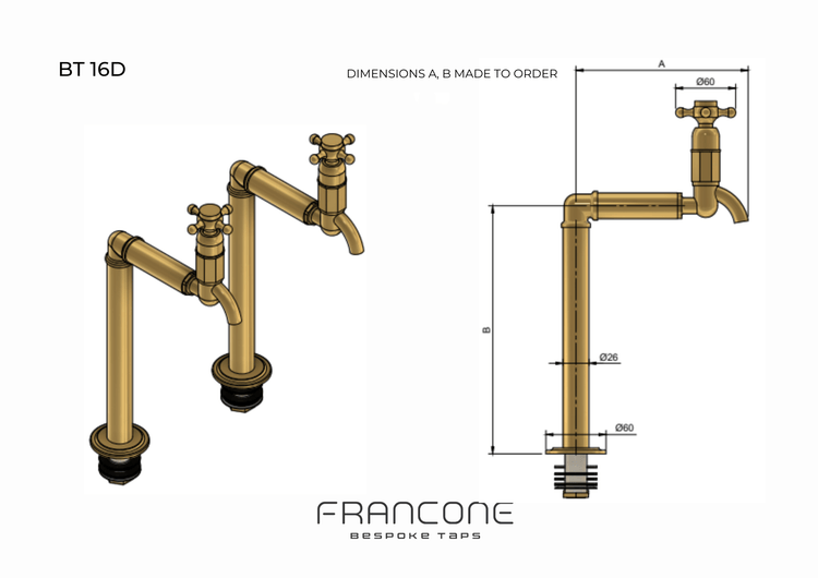 A traditional take on the BT16D, this model is truly versatile, suiting any kind of decor from classic to contemporary depending on your choice of handles. These hot and cold taps are tall as standard so they would suit a deeper basin but can be customised in height and reach as below. Please state in your order notes how long you would like 'A' and 'B' (as shown in the technical drawing) to be. The separate hot and cold delivery gives a nod to the practicality of an old English farmhouse.