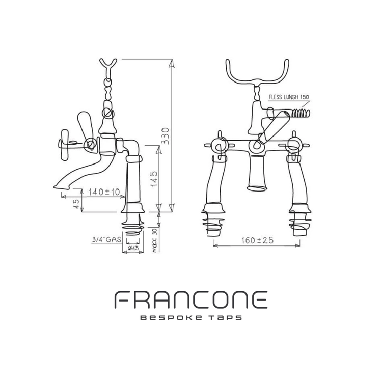 Deck-mounted bath filler tap all brass with hand shower available in different finishes. Great flexibility in terms of installations for baths with width holes from 135 to 185 mm. For Ceramic handles B&W, kindly specify your preference by indicating either Black or White in the order notes.