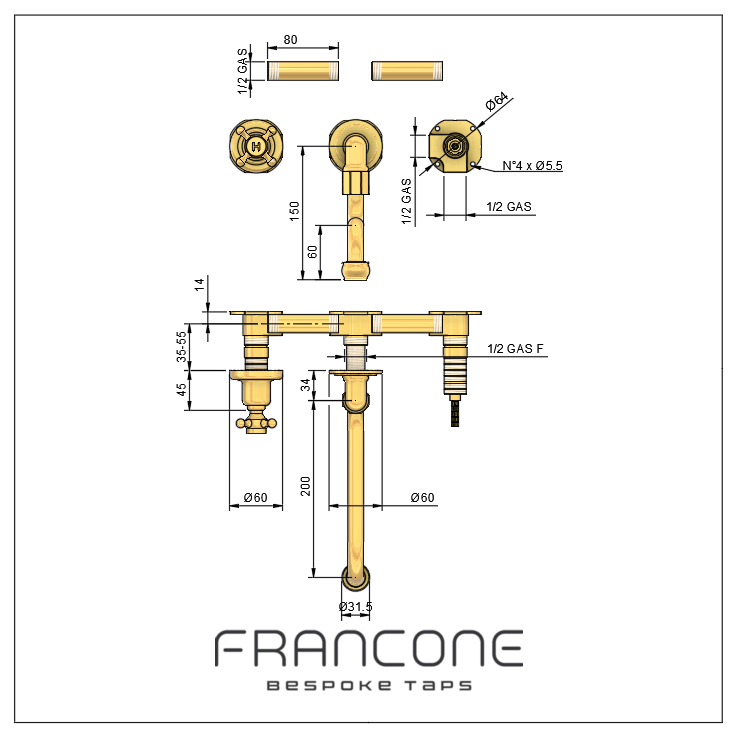 A 3 hole wall-mounted solid brass design with choice of handles.