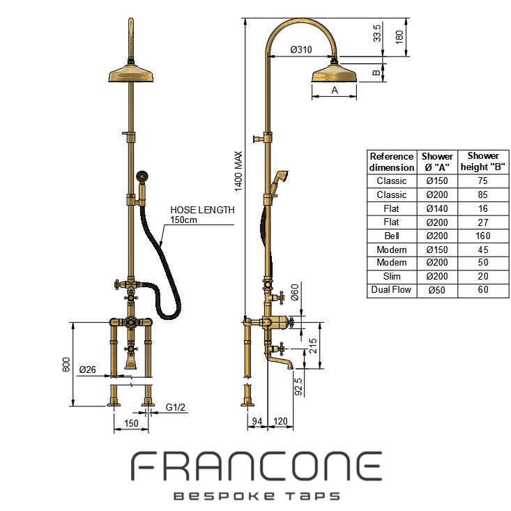 Our BTS3F model is your classic bathroom solution to a shower over a freestanding or fitted bath. The column shower is exposed and features a 200mm shower head (which can be swapped to an 18mm flat version, saving 70mm from the ceiling height when specified) a hand shower attached to the column, and a traditional bath filler, all operated by a thermostatic tap. Choose from straight, arched or curved shower arms. Please indicate your choice in the order notes. The diverter handle will match your choice of handle as standard unless you opt for customisation. Please note, that the flat shower head is 140mm.