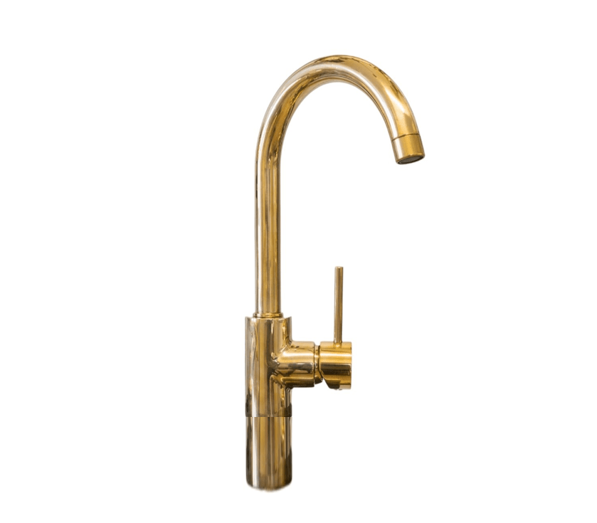 A tall deck-mounted solid brass mixer tap design.