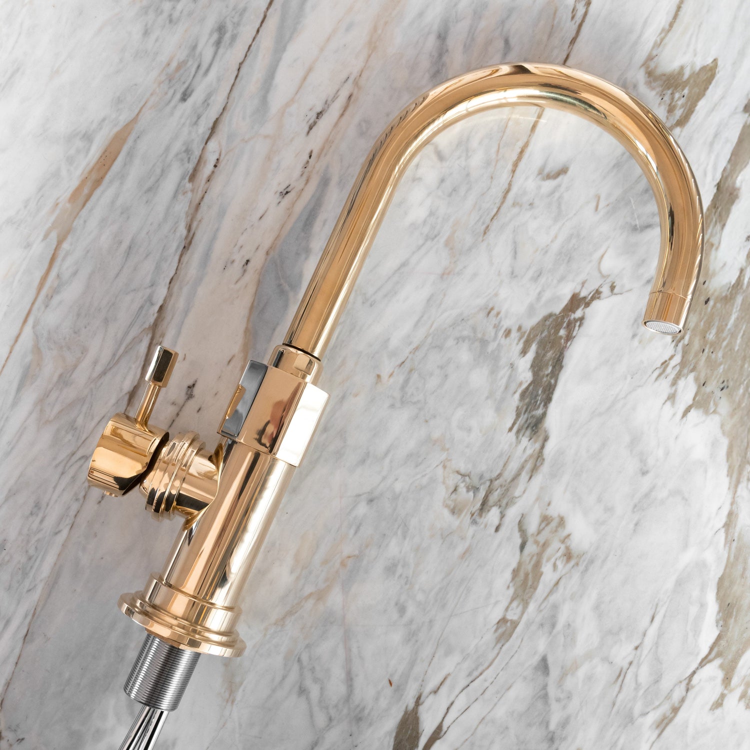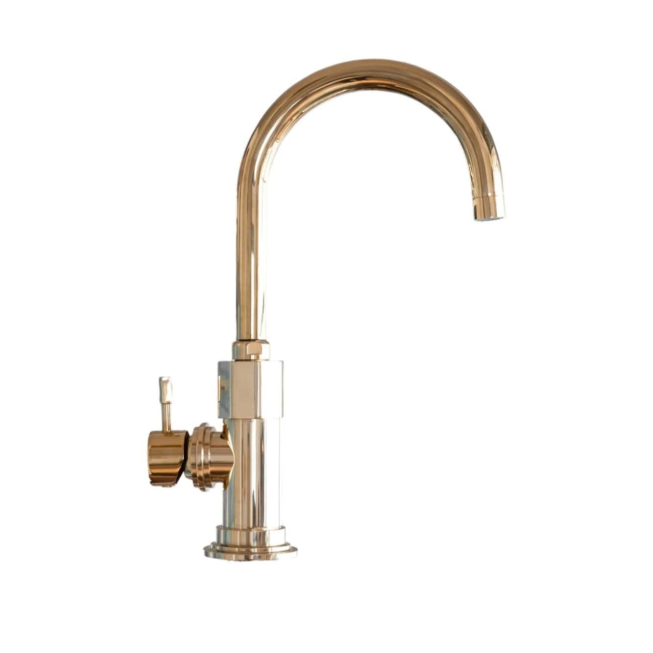 A contemporary deck-mounted solid brass swivel tap with mixer handle.