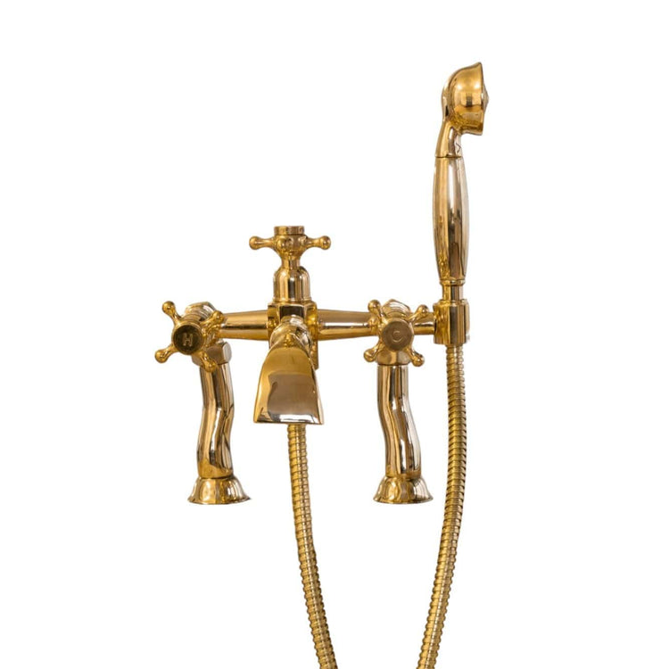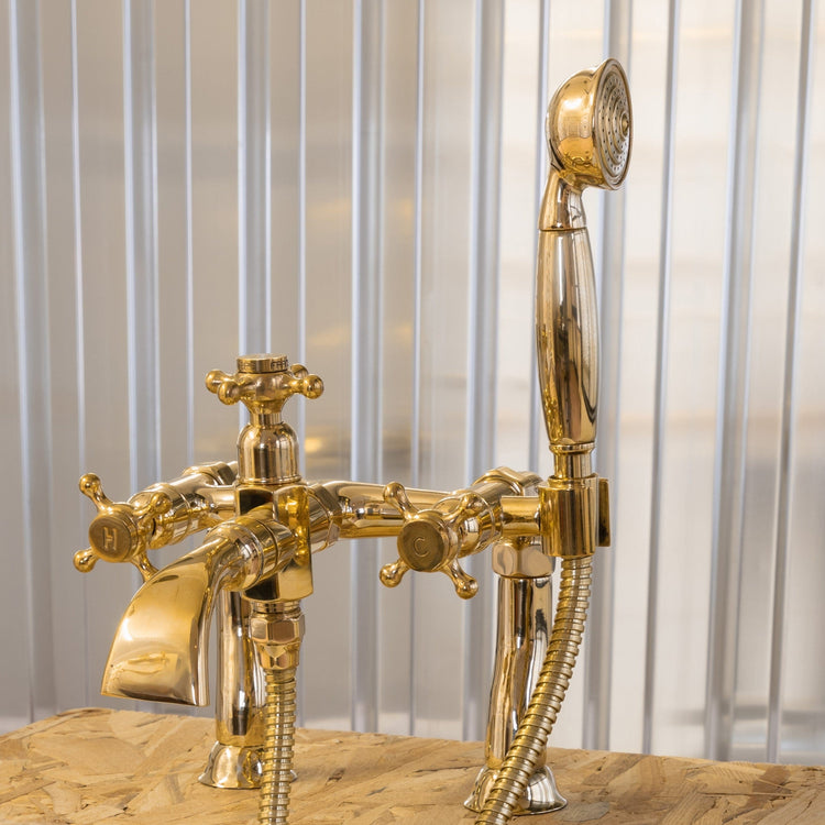 A solid brass wall-mounted bath tap completed with hand shower and diverter.