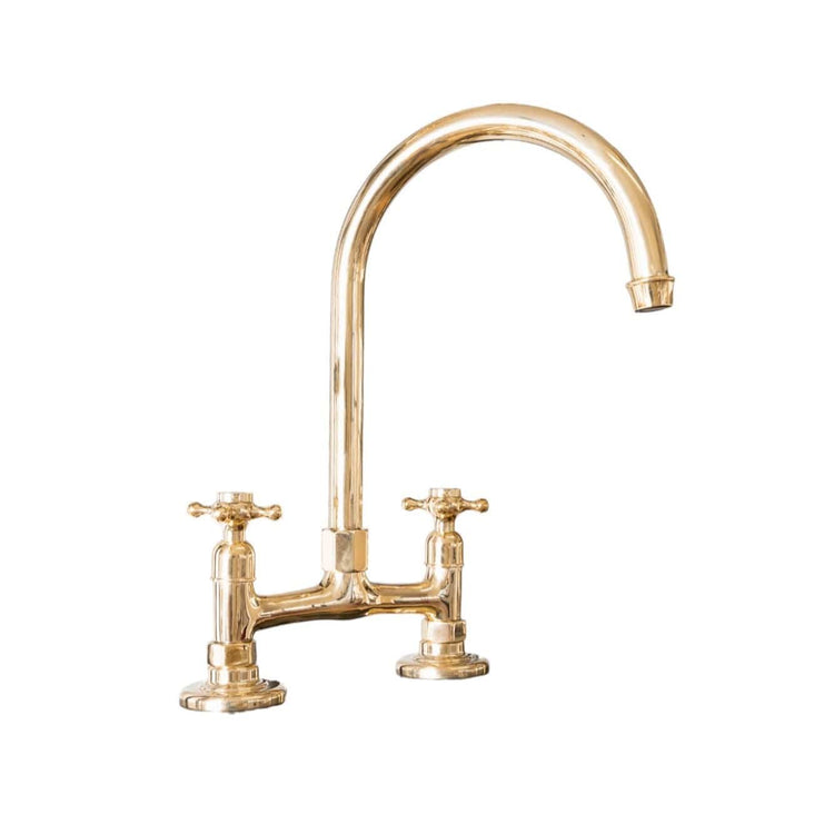 A solid brass deck-mounted kitchen tap with a swivel spout.
