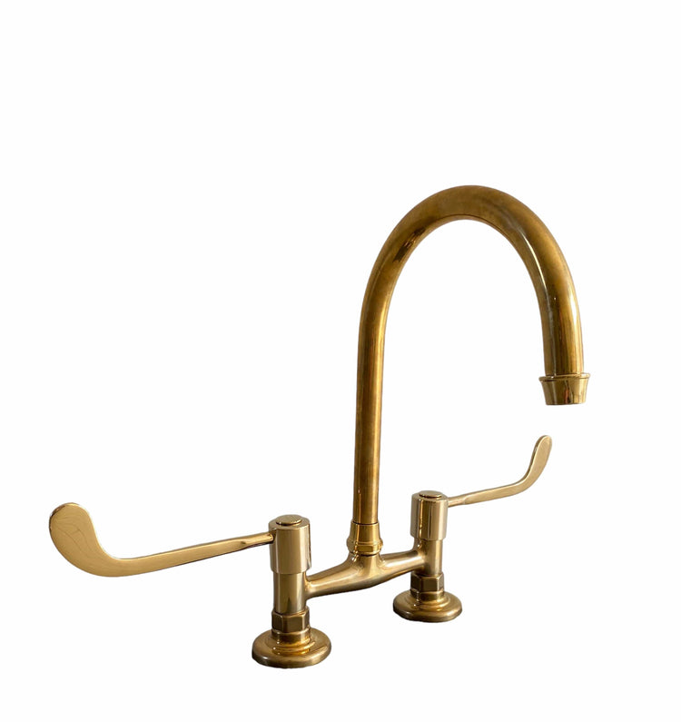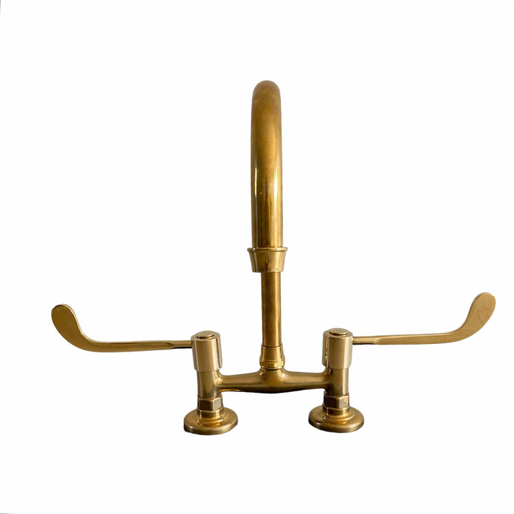 A solid brass deck-mounted kitchen tap with a swivel spout and long levers.