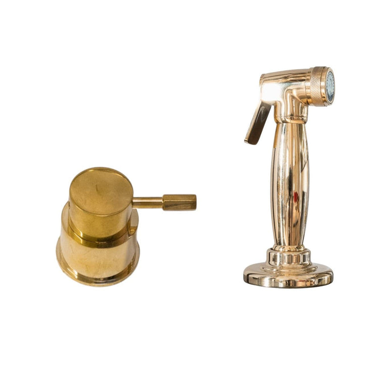 A solid brass deck-mounted trigger-operated mixer tap with hand rinse.