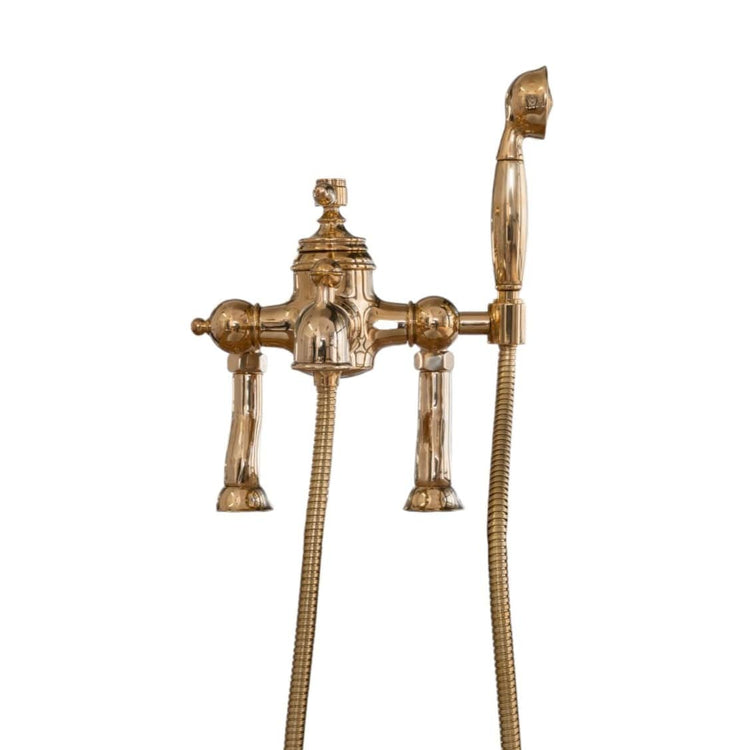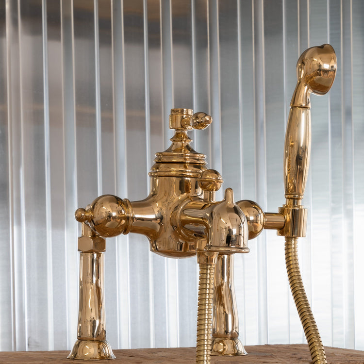 A solid brass deck-mounted mixer bath tap with hand shower.