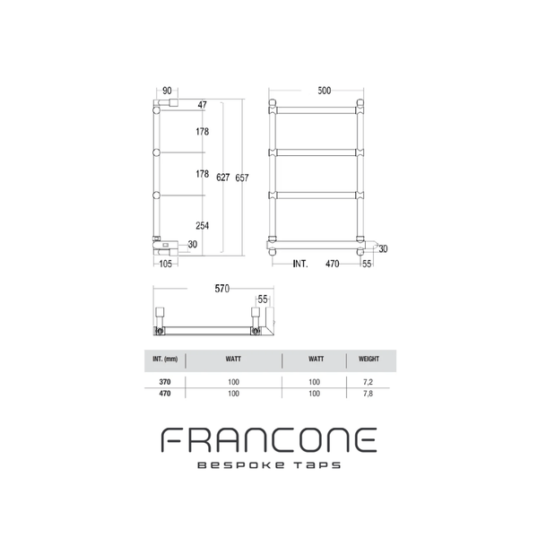 A modern take on our classic heated towel rails, the BTR4 is a four-bar model with a contemporary design. The pipes measure 2.5cm in diameter and the on/off button sits to the right of the unit, as per the image above. Standard connection union 1/2 M with eccentric. Class 1, 220V max 500watt. The on/off switch is NOT included; the switch will need to be wired remotely by the electrician.