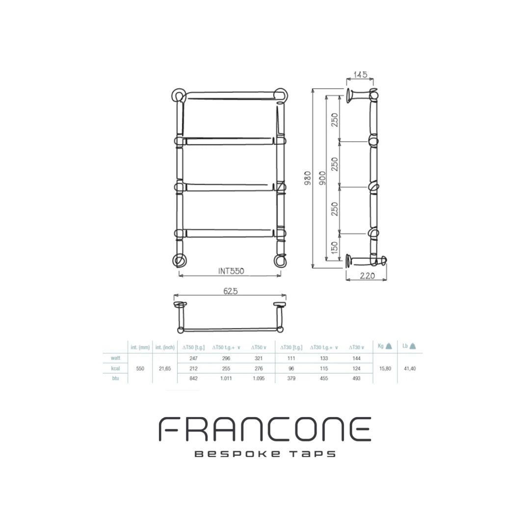 The BTR17 is our standard four-bar heated towel rail design with duel fuel in mind, so it can be plumbed into a central heating system but also has the freedom of an electric heating element. Please see the specific measurements above. Class 1, 220V max 500watt.