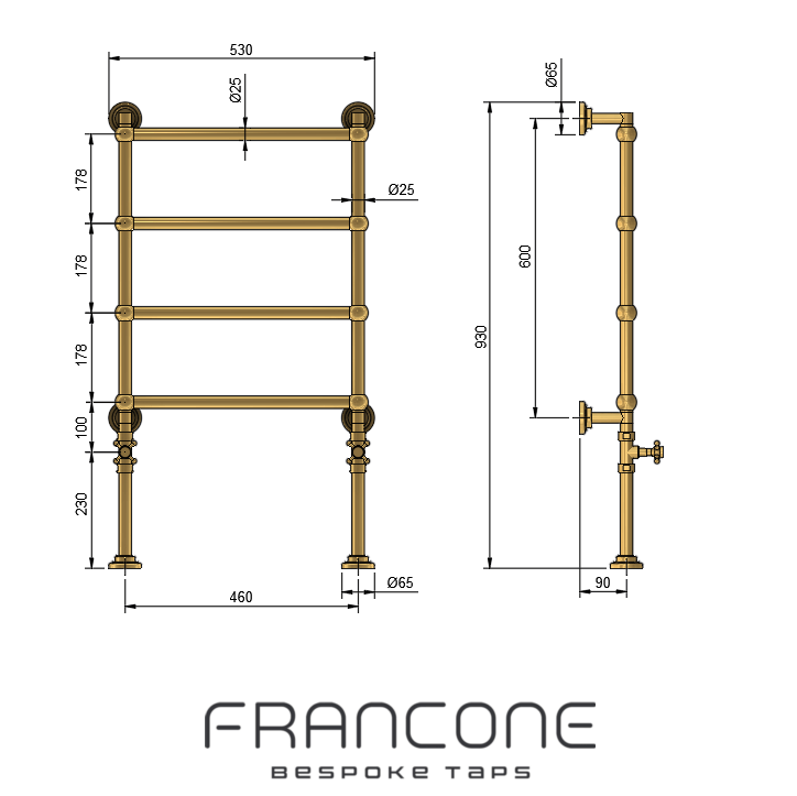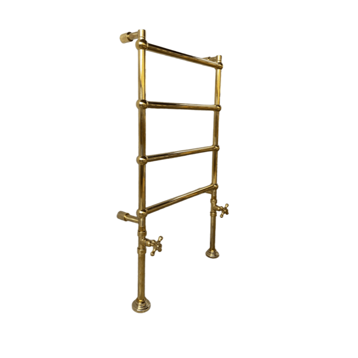 A floor-mounted heated towel rail with a four-bar plumbing system. The BTR20 is a floor-mounted variation of our BTR15 heated towel rail. This design draws inspiration from more traditional aesthetics and allows for your choice of handles positioned at the base of the unit.