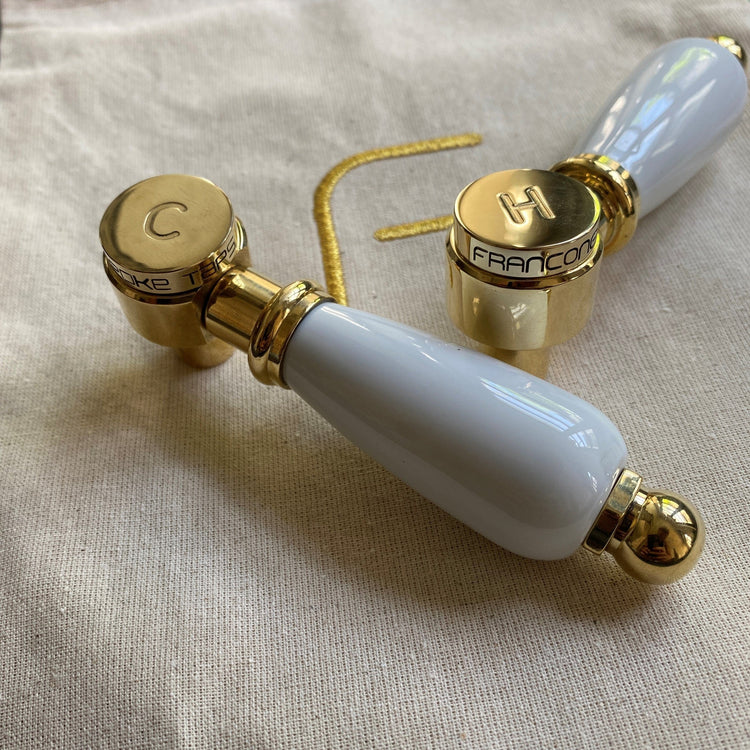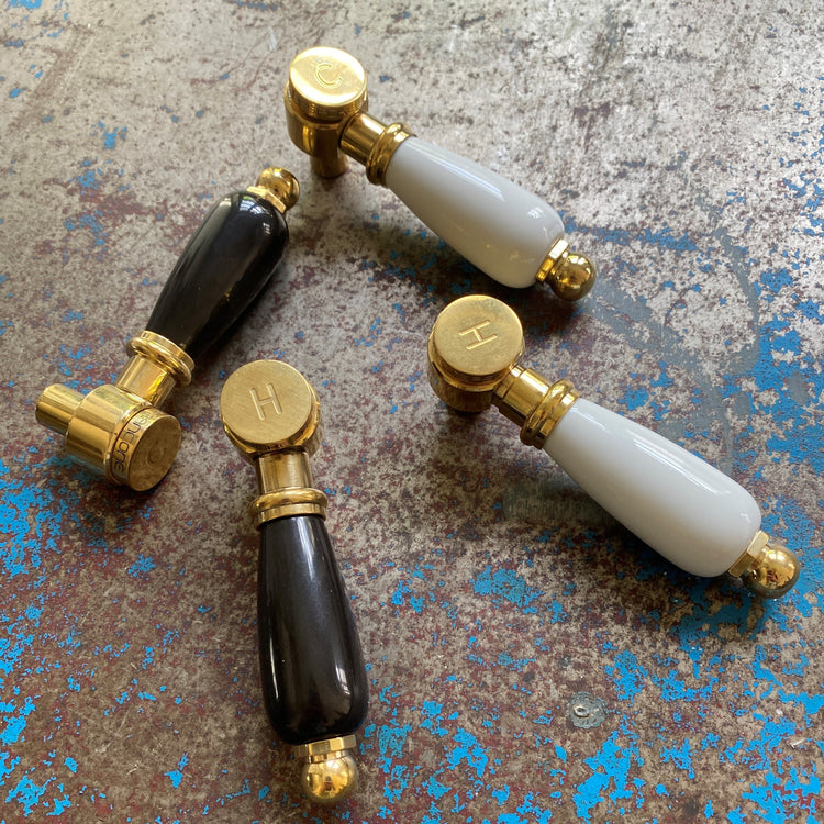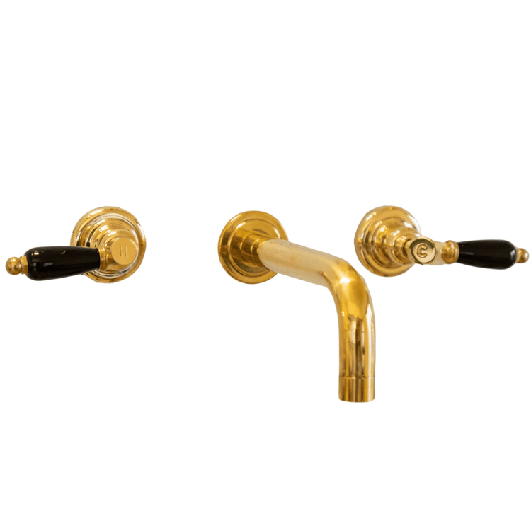 A 3 hole wall-mounted solid brass design with choice of white or black ceramic *lever handles.