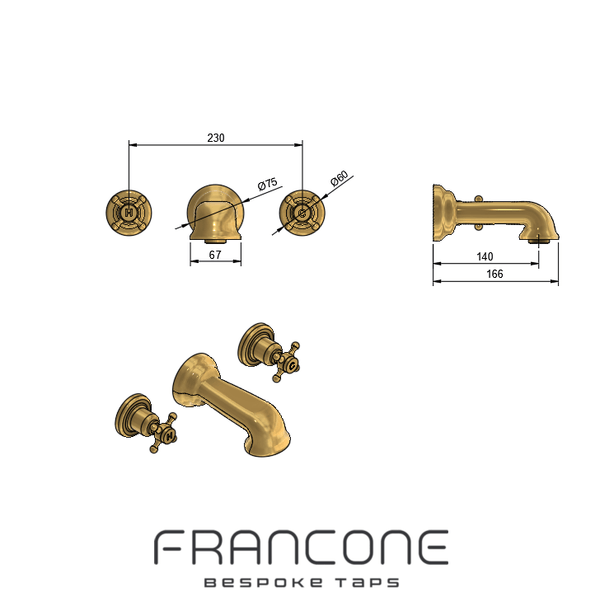 A 3 hole wall-mounted solid brass bath filler with choice of handles.