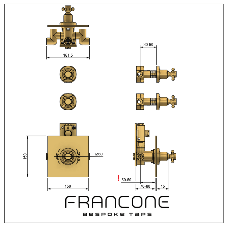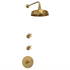 A solid brass wall-mounted thermostatic dual-outlet shower with single thermostatic handle. Available with classic round plate or with a square plate.