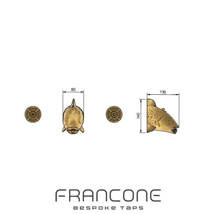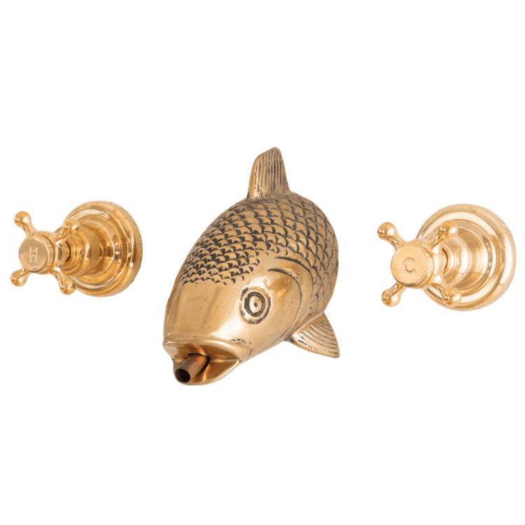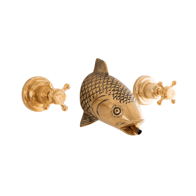 A solid brass wall-mounted tap with fish head spout.