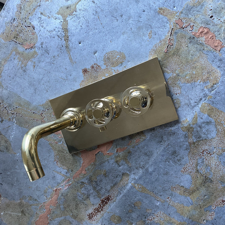 A concealed wall-mounted thermostatic tap with a combination of different handles and a solid brass backplate. One handle opens/closes the water supply and the second handle (with engraved H/C on the plate) sets the water temperature.