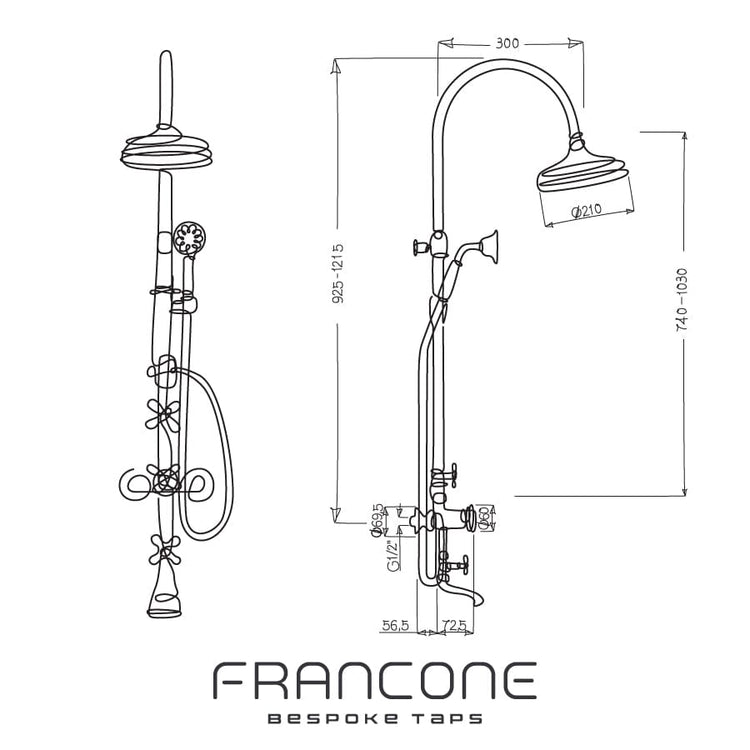 Our BTS3 model is your classic bathroom solution to a shower over a freestanding or fitted bath. The column shower is exposed and features a 200mm shower head (which can be swapped to an 18mm flat version, saving 70mm from the ceiling height when specified) a hand shower attached to the column, and a traditional bath filler, all operated by a thermostatic tap. Please note, that the flat shower head is 140mm.