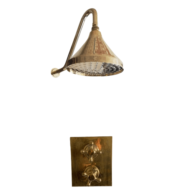 A solid brass wall-mounted thermostatic shower with bell-shaped head.