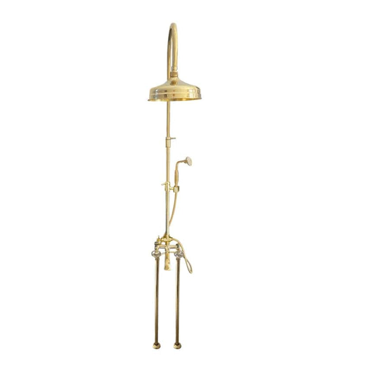 A solid brass adjustable floor mounted column shower with hand shower and bath filler.