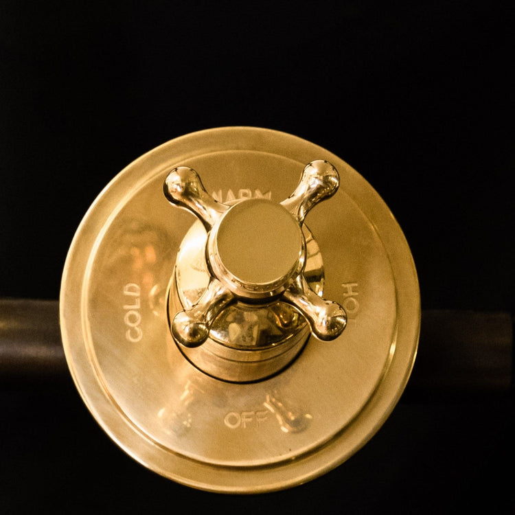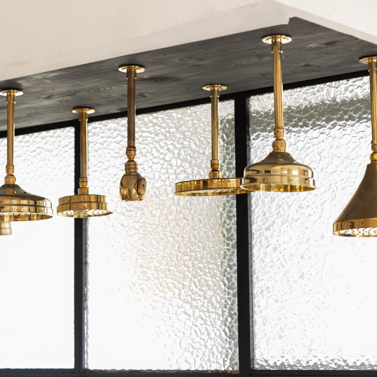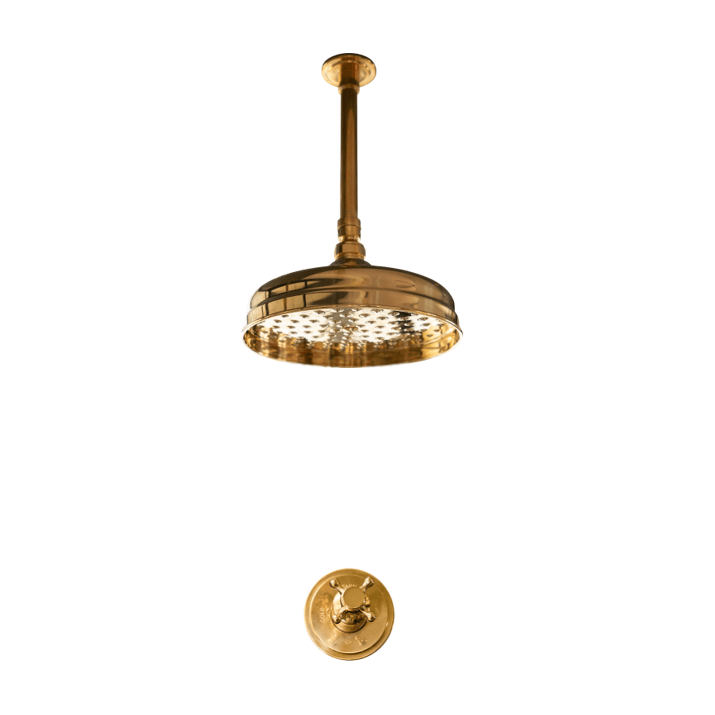A solid brass ceiling-mounted shower with progressive mixer.