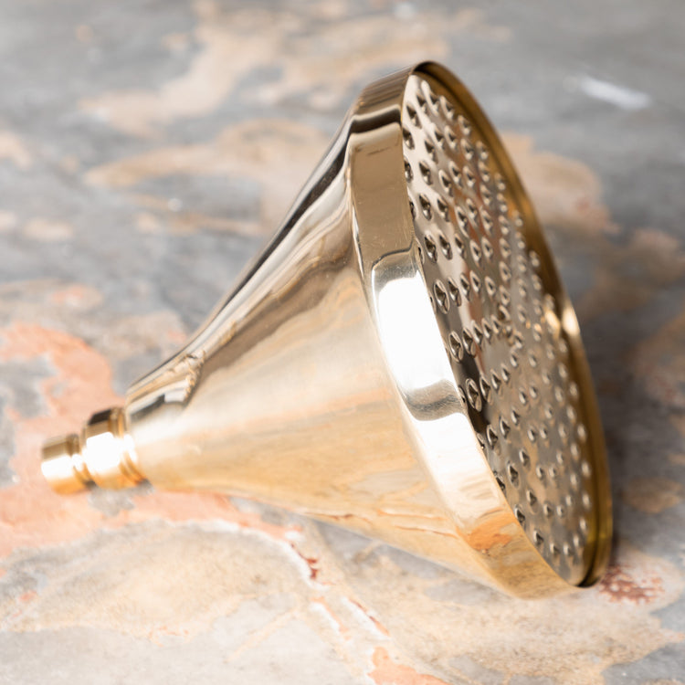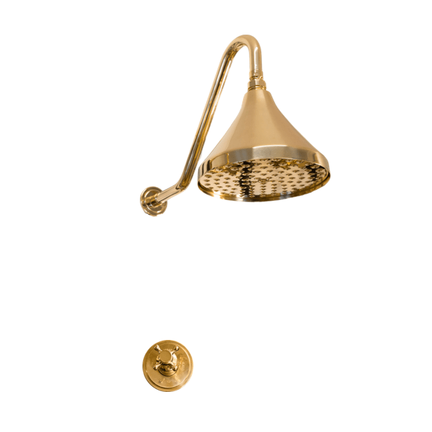 A solid brass wall-mounted progressive mixer shower with bell-shaped head.