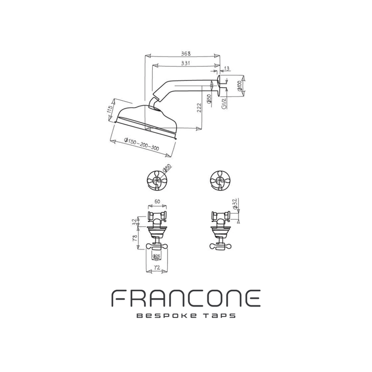 A simple and effective design, the BTS9 is made of our classic 15-20cm angleable shower head on a thicker arm of 5cm diameter which is wall-mounted. In this model, the hot and cold water is operated by separate taps in a design of your choice.