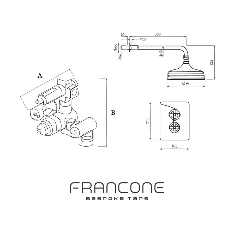 The BTS1H comprises of a slim wall-mounted shower head with a concealed thermostatic mixer. The backplate is 0.5cm thick and the slim shower head measures 25cm, with an adjustable angle. This model is highly customisable, with options to use different shower heads from our collections. The hexagonal-shaped handle pins can be positioned either facing up or down, allowing for customization based on personal preference.