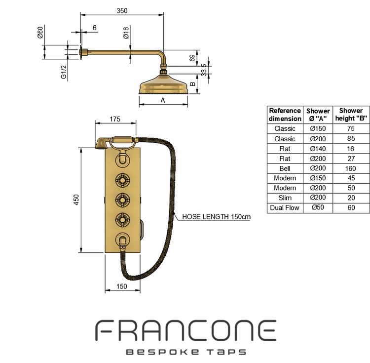 The unusual BTS40 shower model is made to order and comprises a classic wall-mounted shower head that measures 150-200mm and adjusts in angle paired with a large thermostatic mixer. This houses a dual control handle setup, dictating the flow and temperature of water alongside a hand shower cradle and hand shower handle, all together in one solid brass back plate.