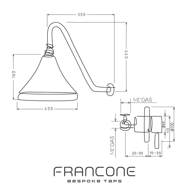 A solid brass wall-mounted progressive mixer shower with bell-shaped head.