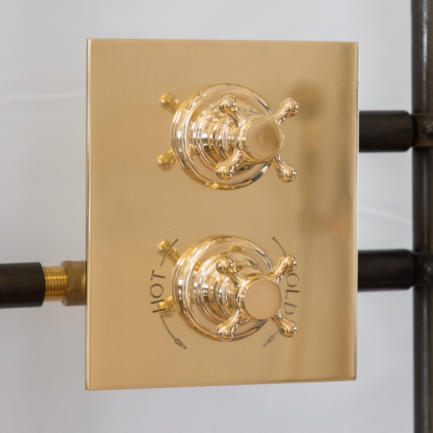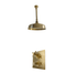 A solid brass ceiling-mounted thermostatic shower with bespoke handles.