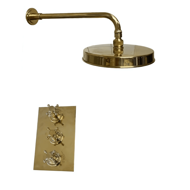 Our BTS34 model features our flat shower head which measures 140mm/200mm with an adjustable angle head and a thermostatic mixer that controls the temperature, showerhead flow, and hand shower (BTS23) or bath filler (BTS15) flow. Which can be added separately. Our newly upgraded backplate comes in thick solid brass with Hot and Cold engraved. Please note, that the flat shower head is 140mm.