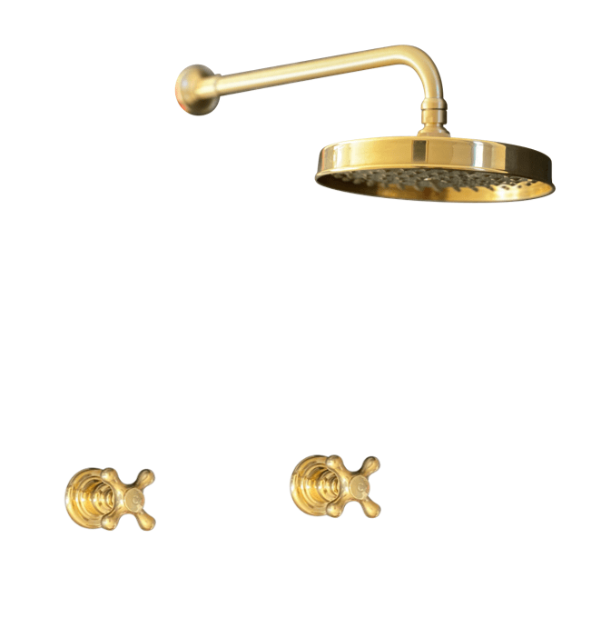 A solid brass wall-mounted shower with classic handles.