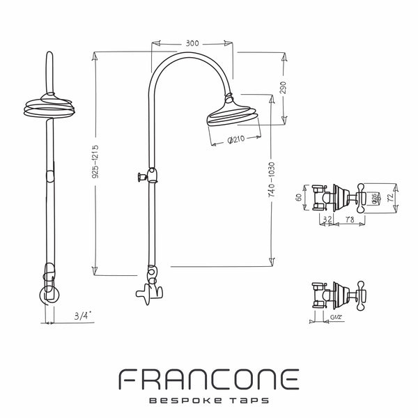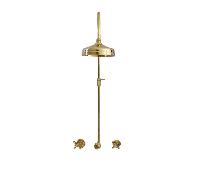 Our BTS37 comprises a column with a curve and 20cm adjustable angle shower head and two traditional handles in the design of your choice which can be placed wherever you wish. We are able to swap the shower head shown here for a flat 1.8cm model which saves 7cm from the ceiling height.