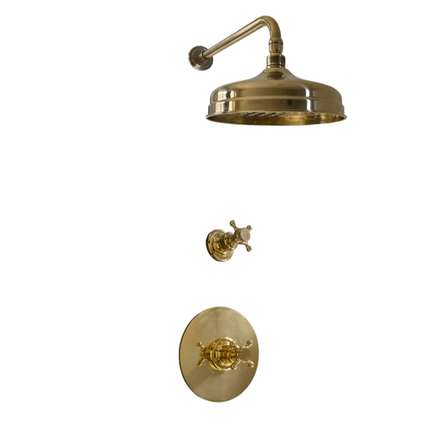 A solid brass wall-mounted thermostatic shower with single thermostatic handle plus an on-and-off valve. Available with classic round plate or with a square plate that comes with different modern cover bases.