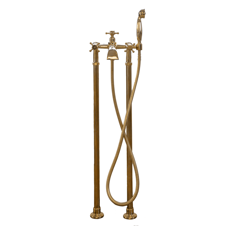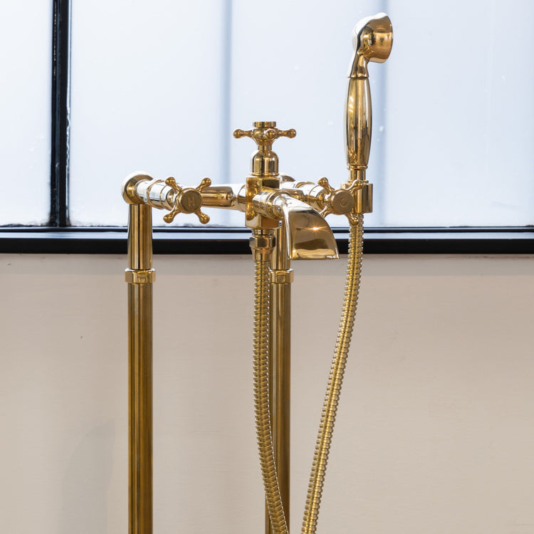 A solid brass floor-mounted bath tap completed with hand shower and diverter.