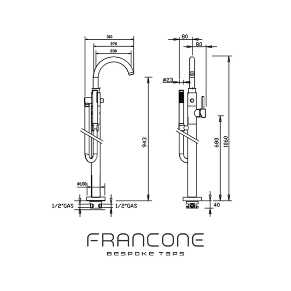 A solid brass floor-mounted bath filler with mixer and hand shower.