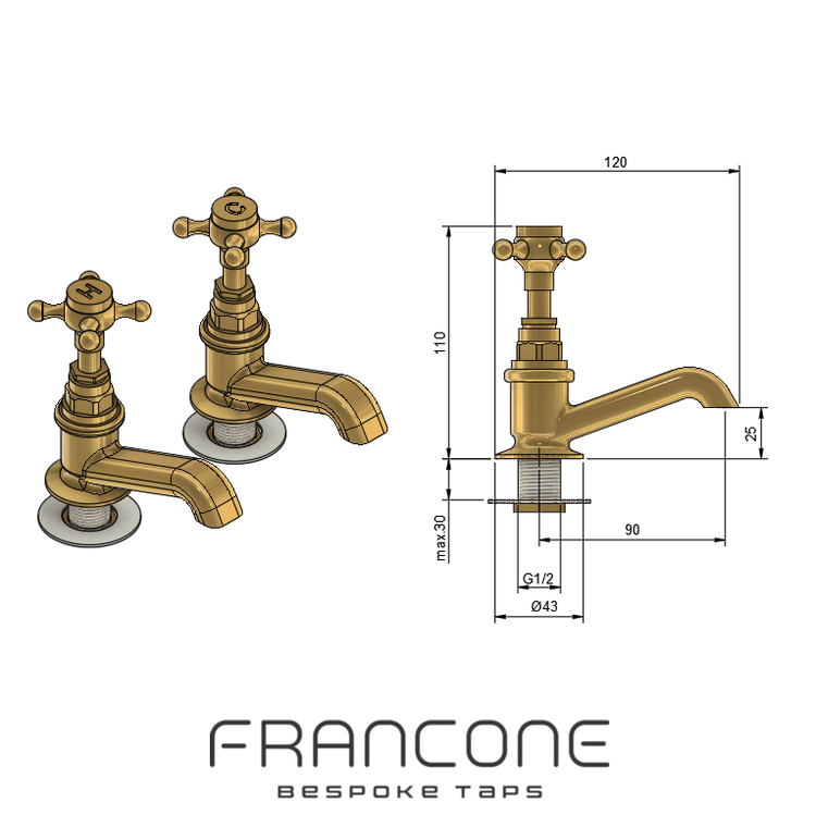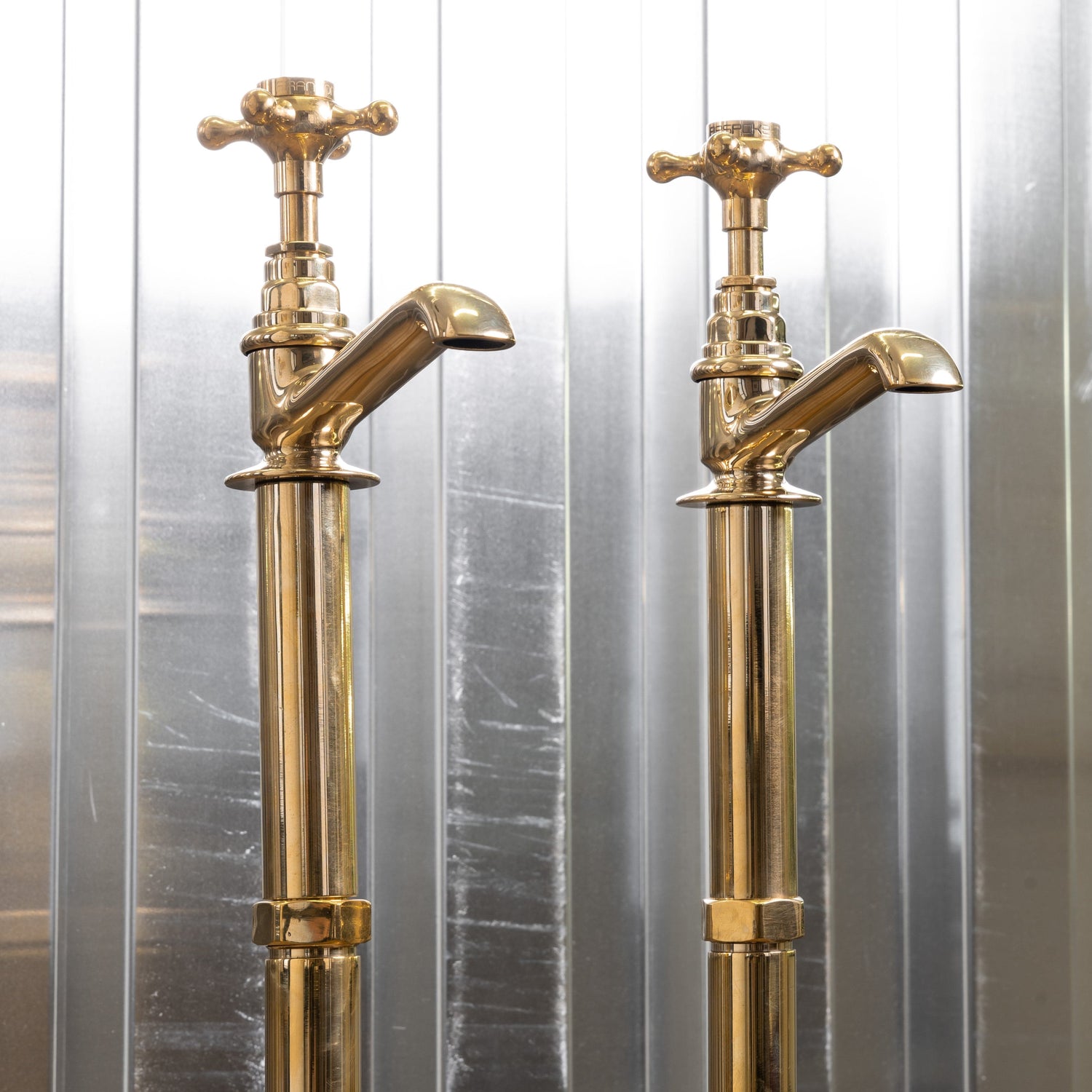 A pair of solid brass pillar taps. Our BT15F floor-mounted tap crafted to any height you need, from vessel basins to deep farmhouse baths. Proportional, architectural, and made in solid brass to order. In a 2 hole left and right layout, this design is immensely versatile and suits bathrooms with smaller basins best due to the 9cm spout length. If you'd like to add a different feel to the heritage tap design, take your pick from alternative handle designs.