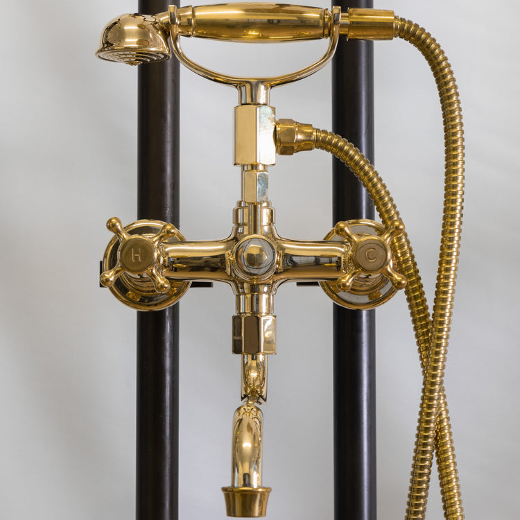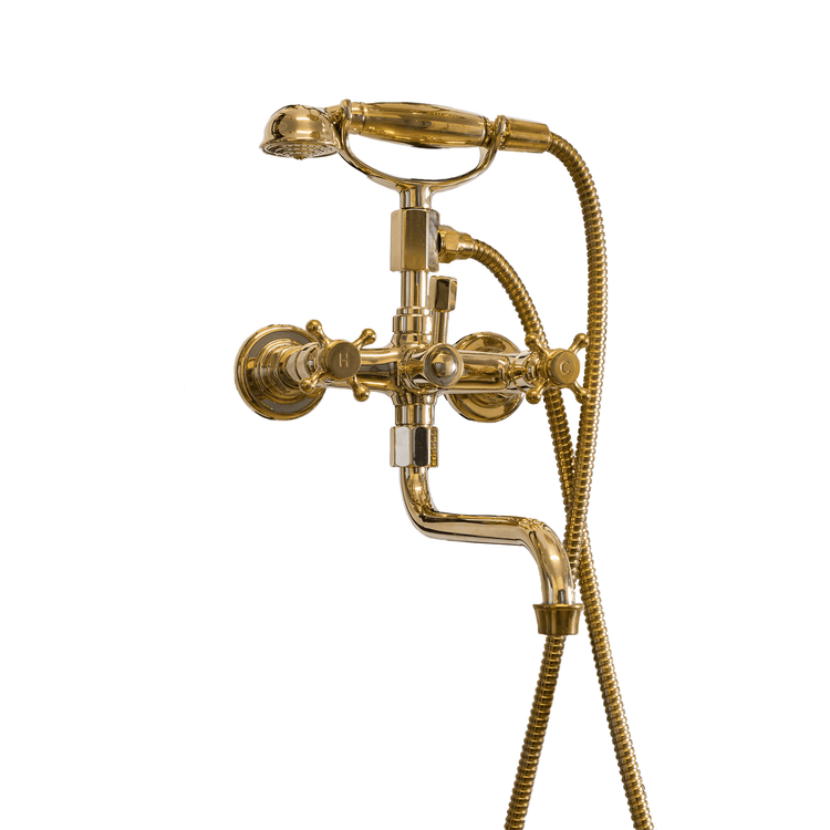 A solid brass wall-mounted bath tap with a hand shower, featuring a traditional swivel spout.