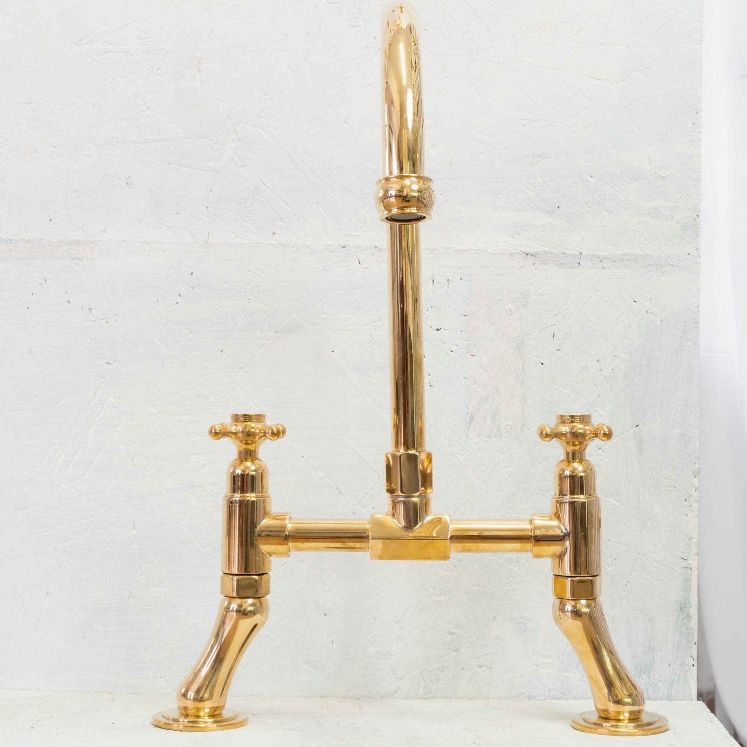 A solid brass deck-mounted kitchen tap with a swivel spout and eccentric pipes at the base.
