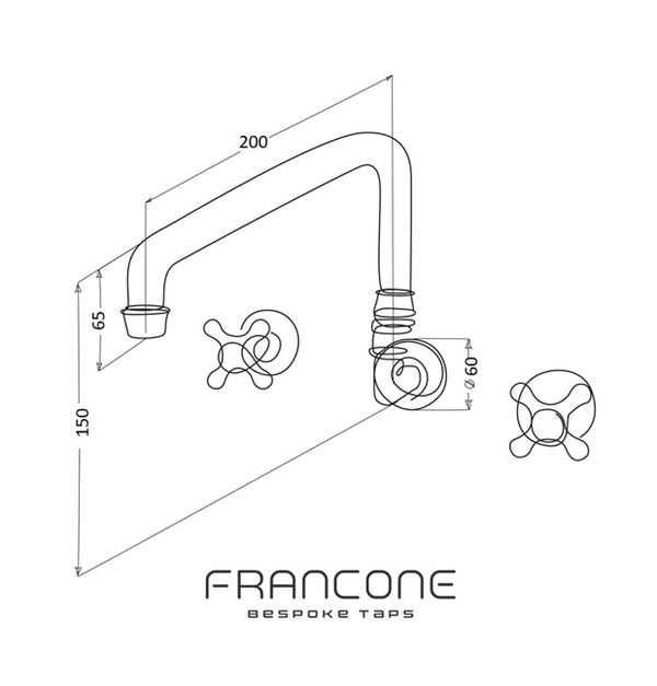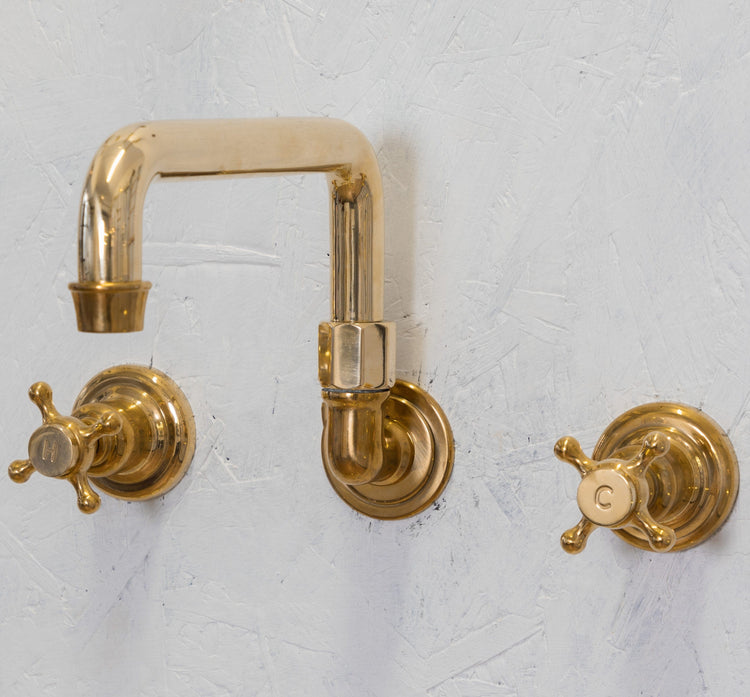 A 3 hole wall-mounted solid brass bridge tap with choice of handles.
