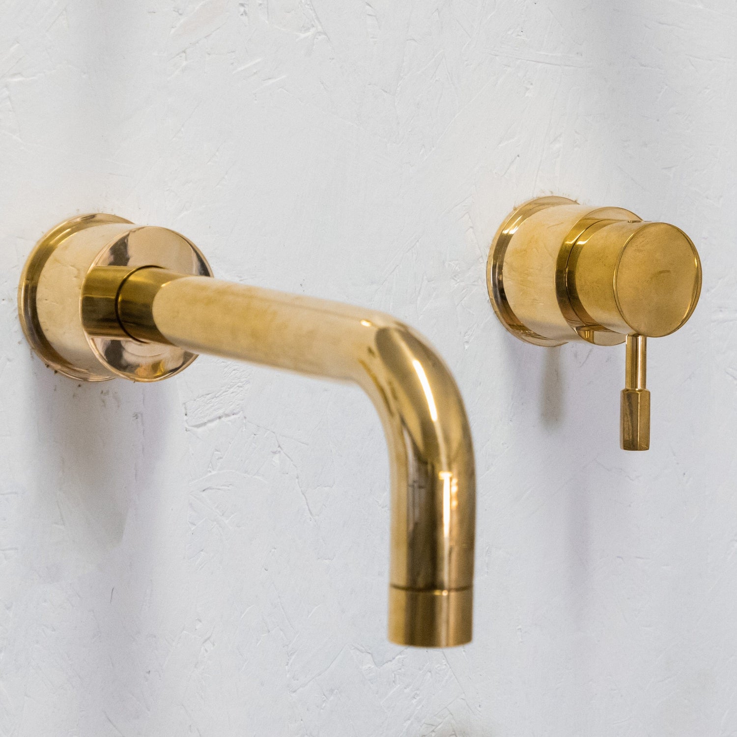 A solid brass wall-mounted mixer tap.
