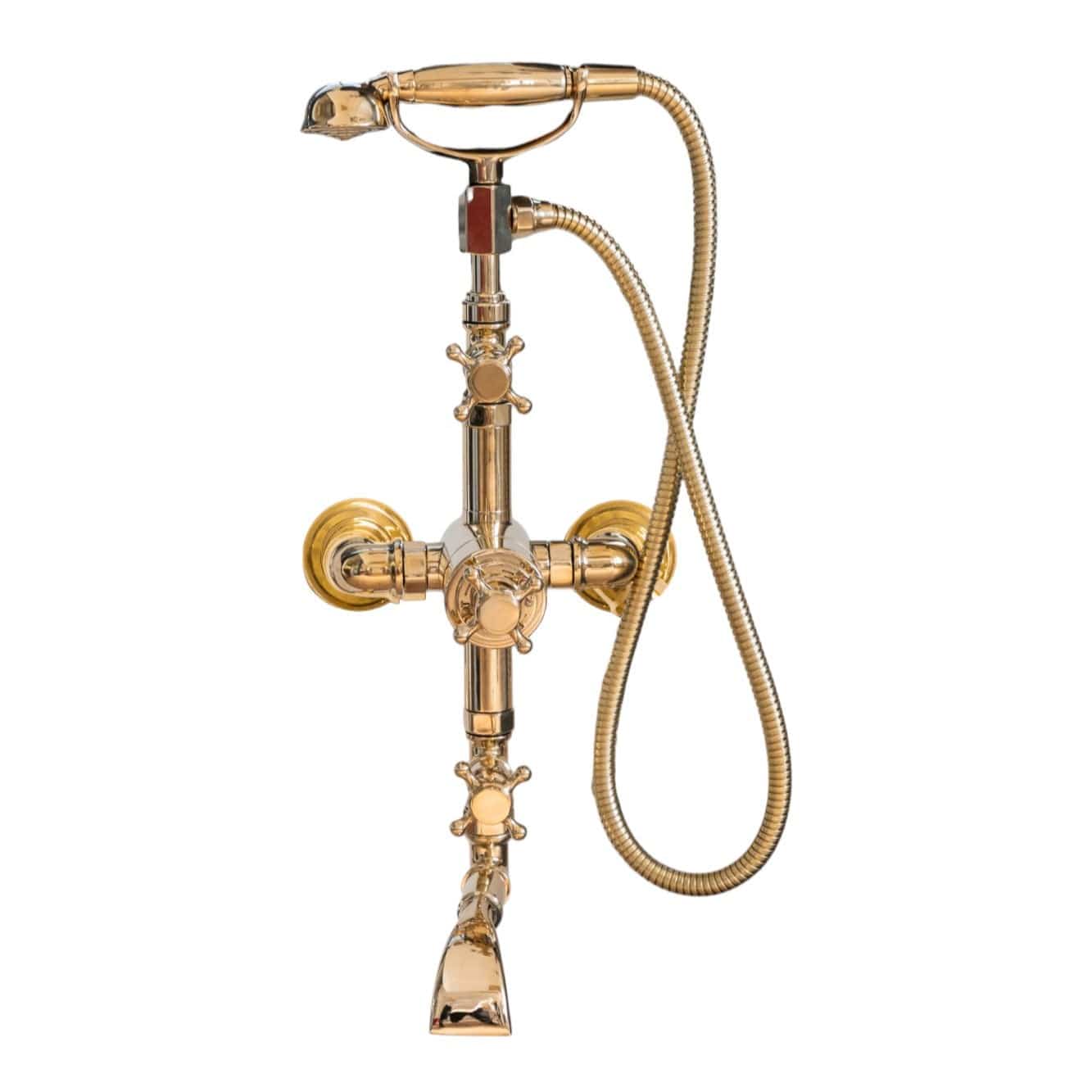 A solid brass wall-mounted thermostatic bath tap with a hand shower.