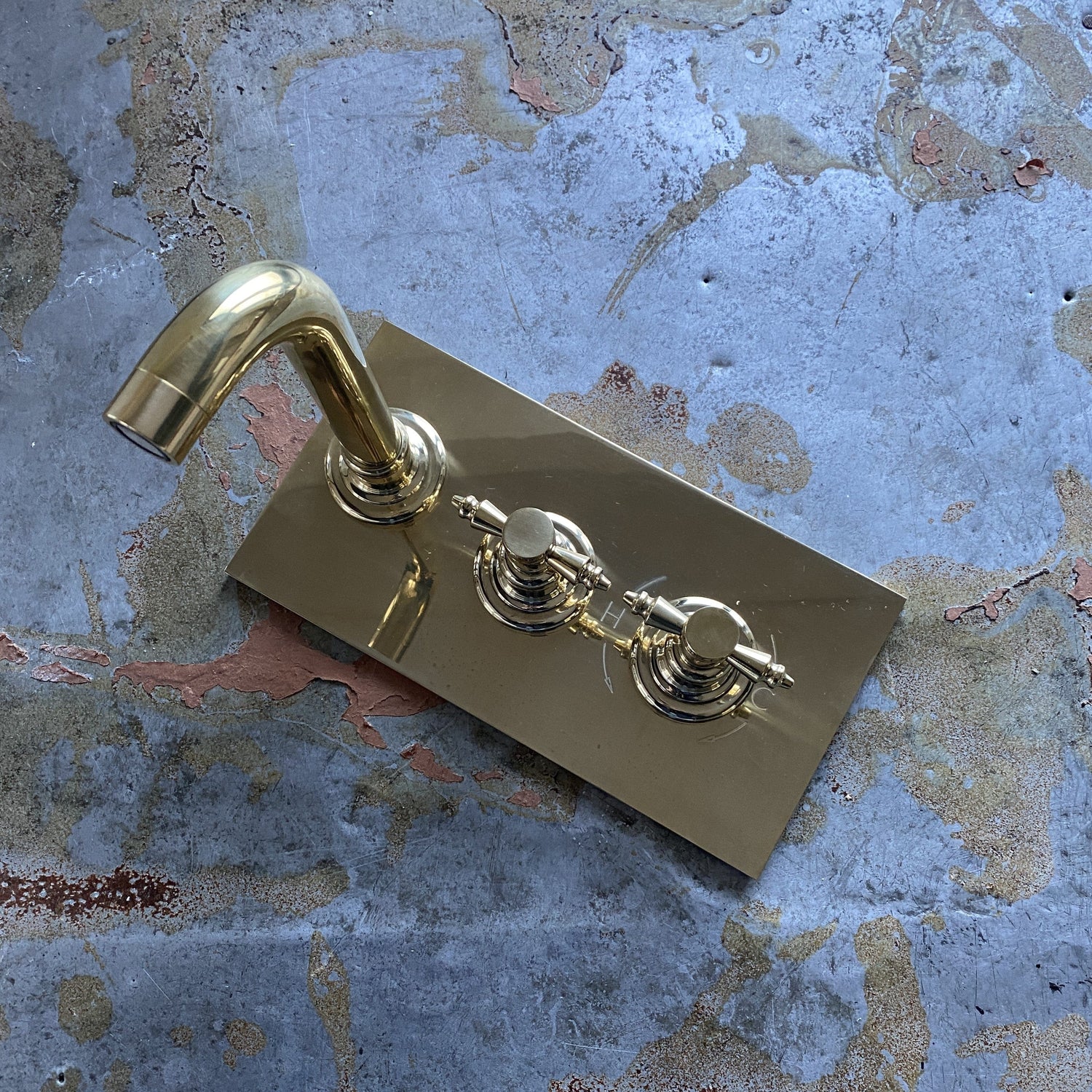 A concealed wall-mounted thermostatic tap with a combination of different handles and a solid brass backplate. One handle opens/closes the water supply and the second handle (with engraved H/C on the plate) sets the water temperature.