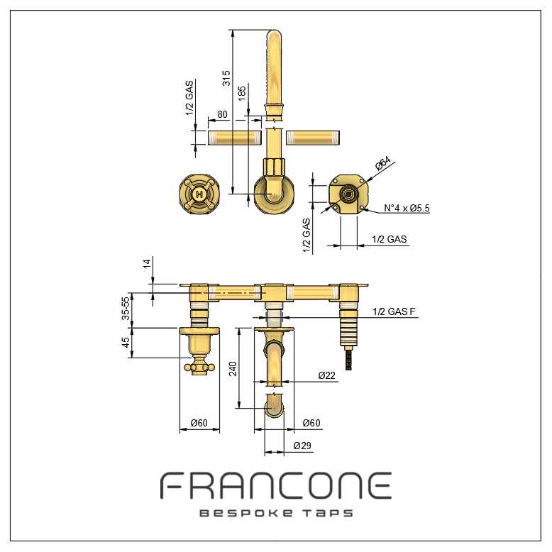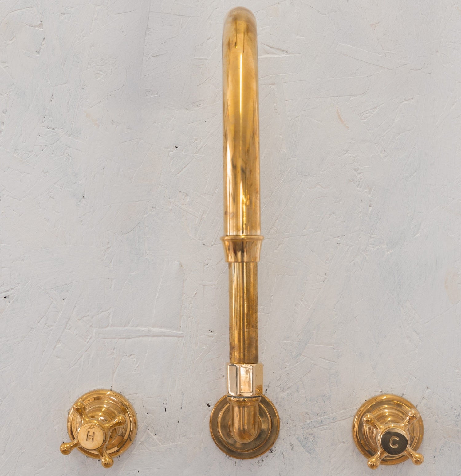 A bespoke solid brass wall-mounted tap with a swivel spout.