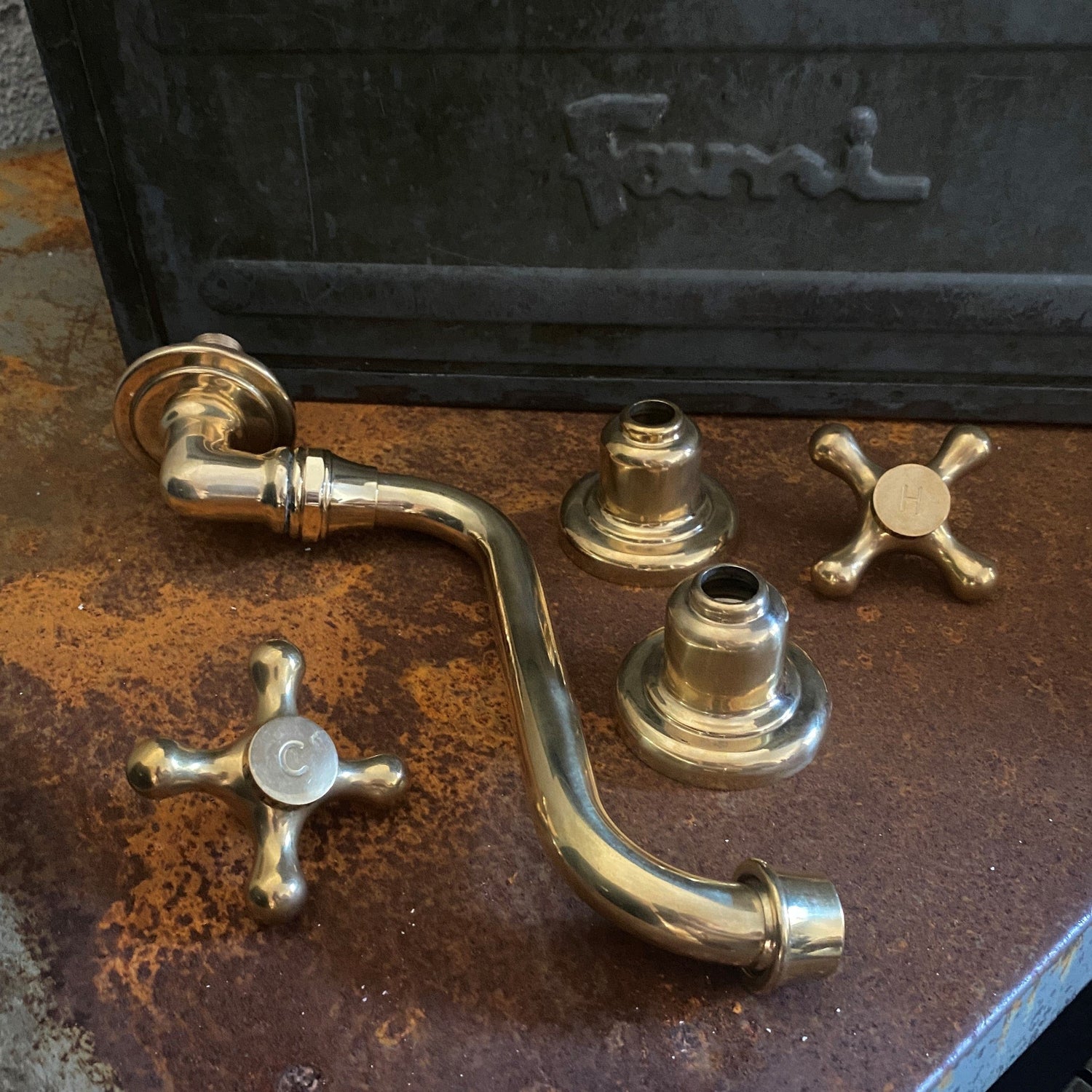 A 3 hole wall-mounted solid brass design with choice of handles.