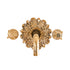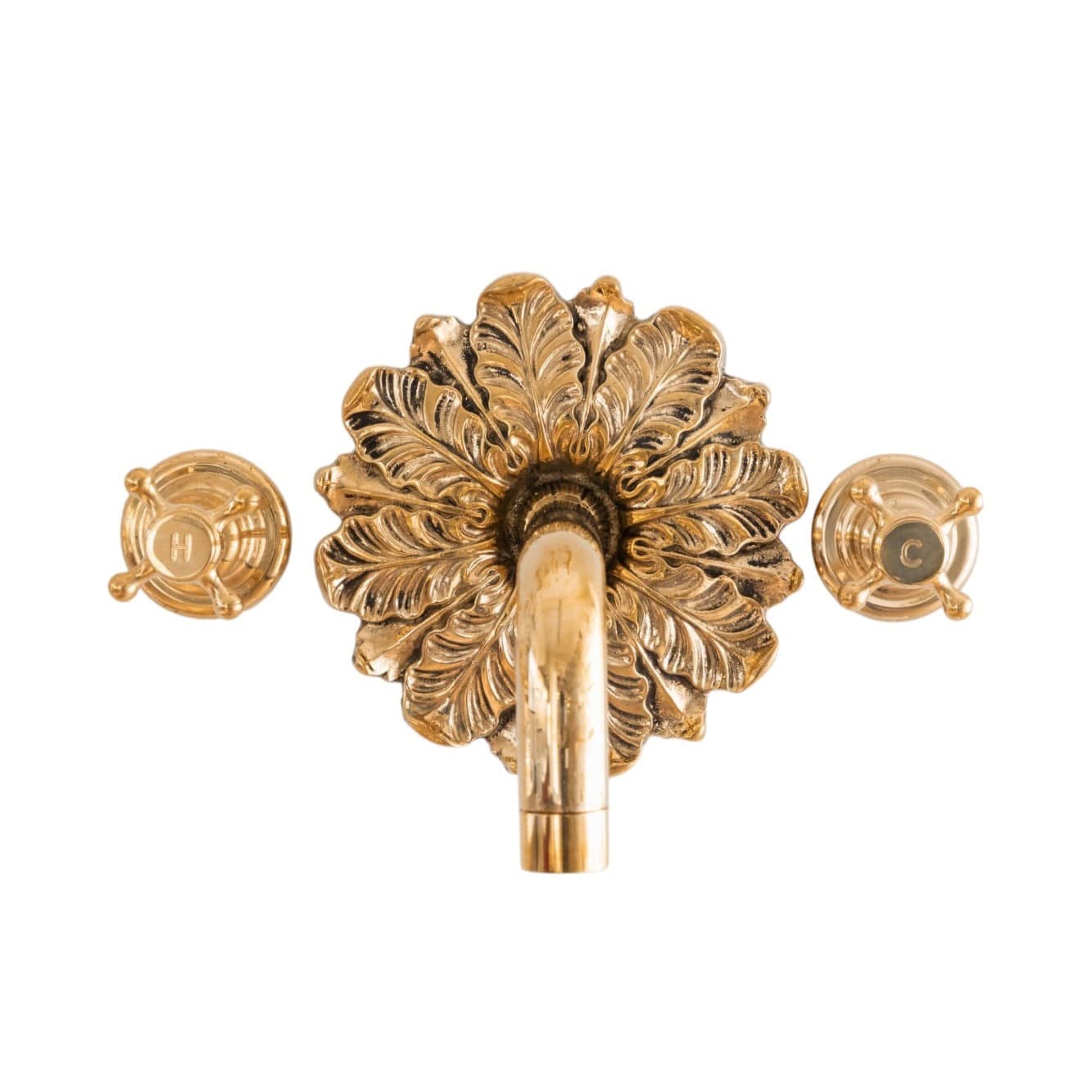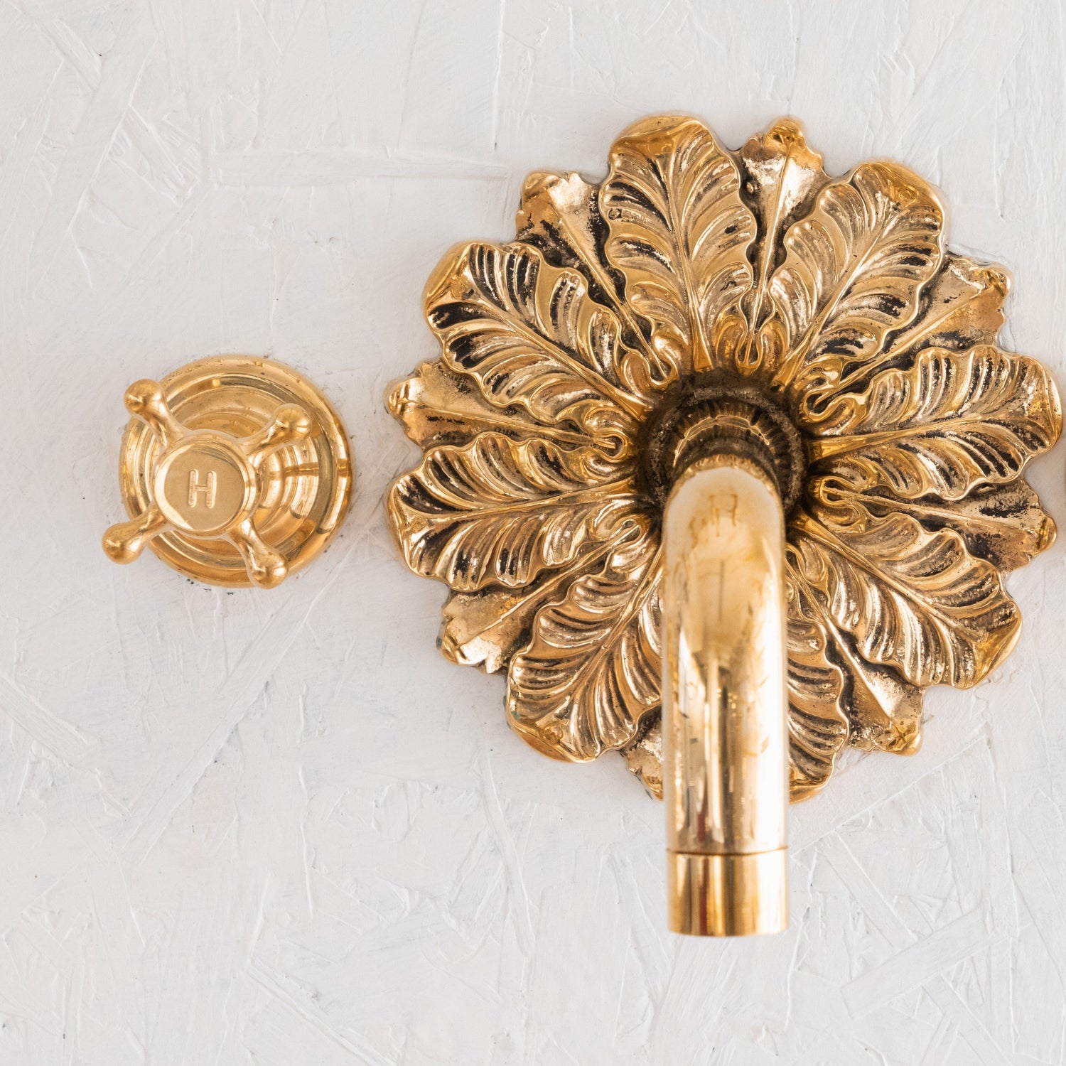 A solid brass wall-mounted tap with an ornamental backplate.
