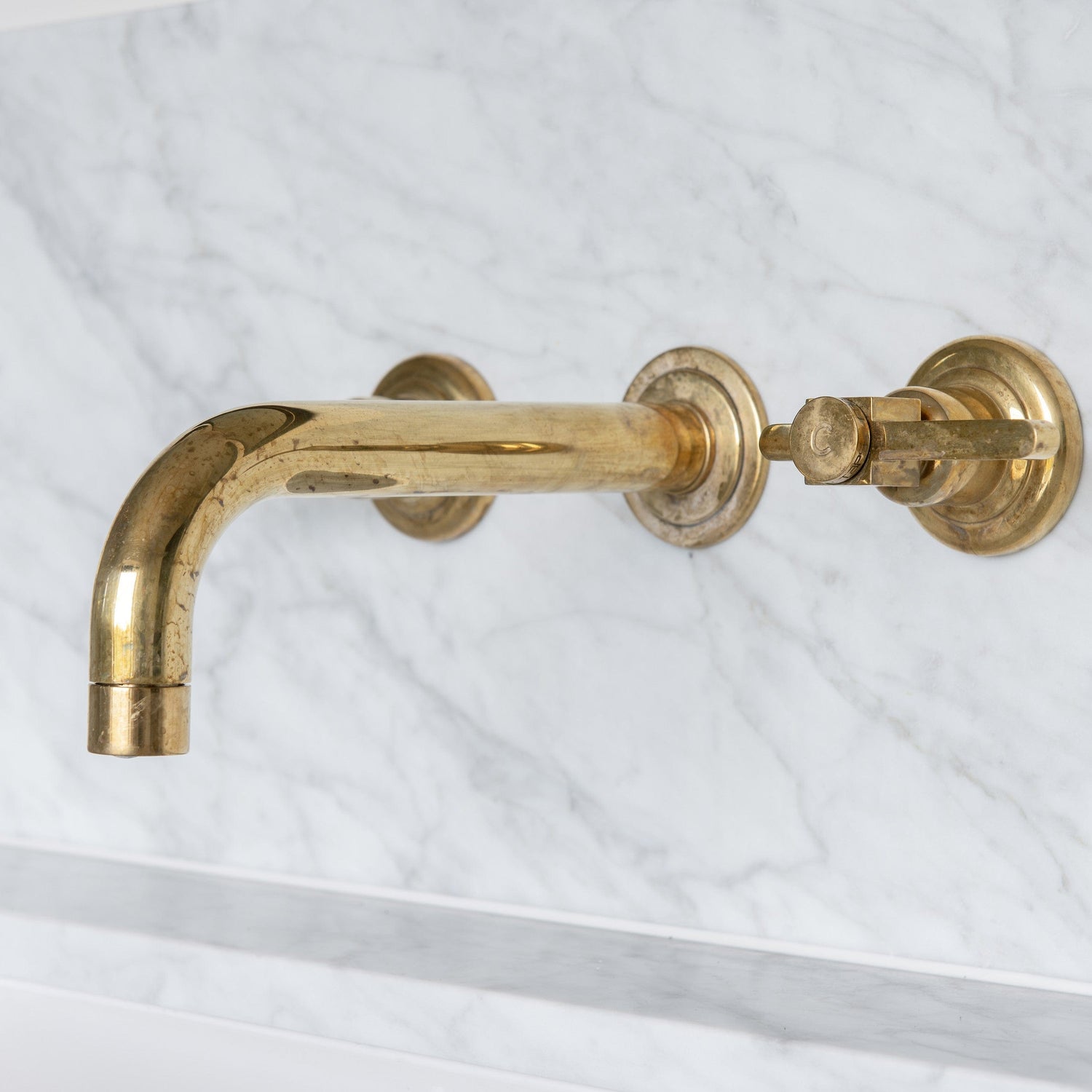 A three-hole solid brass wall-mounted basin tap with handcrafted lever handles.