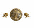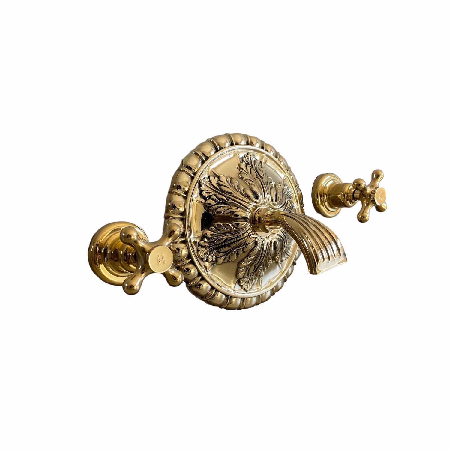 A solid brass wall-mounted tap with ornate back plate.