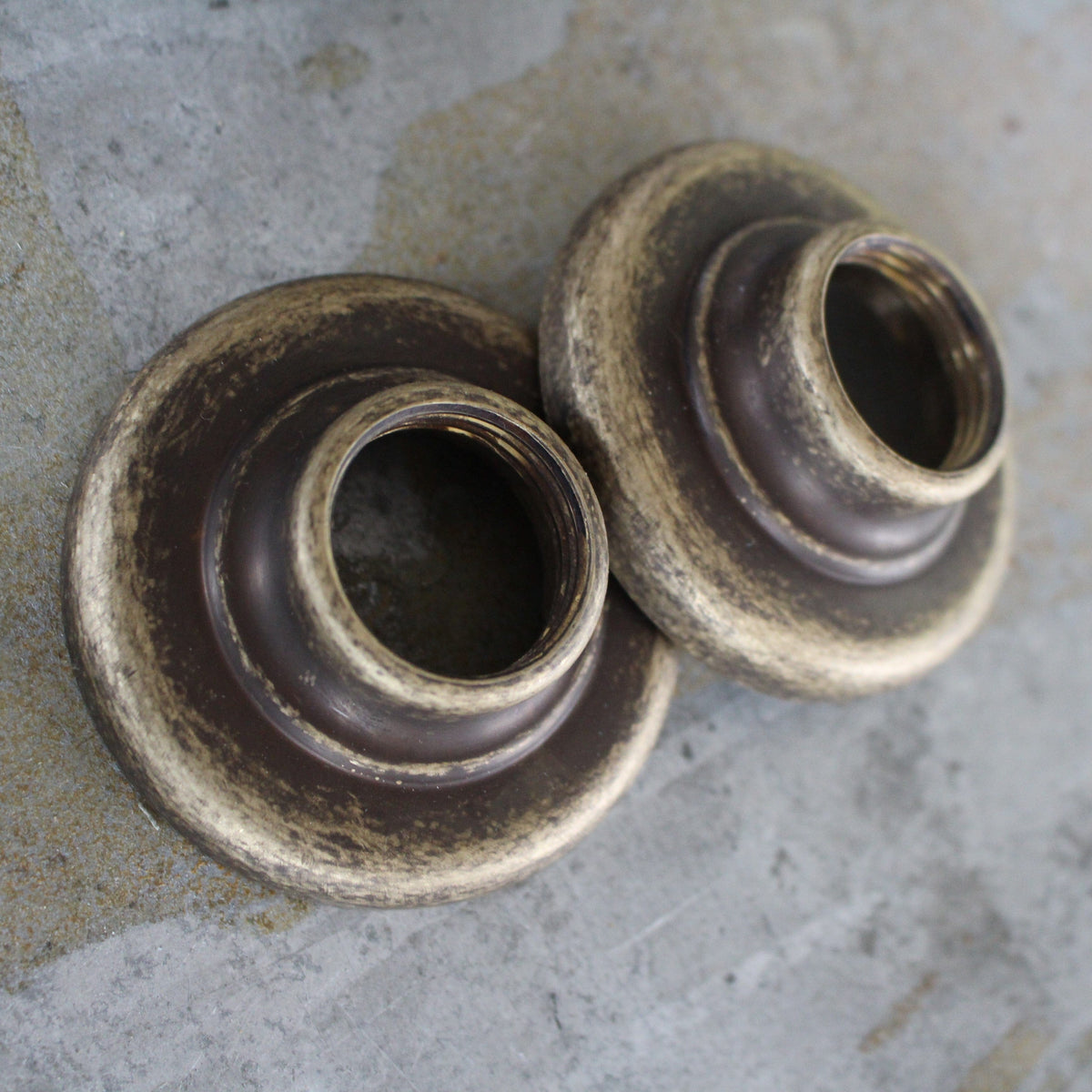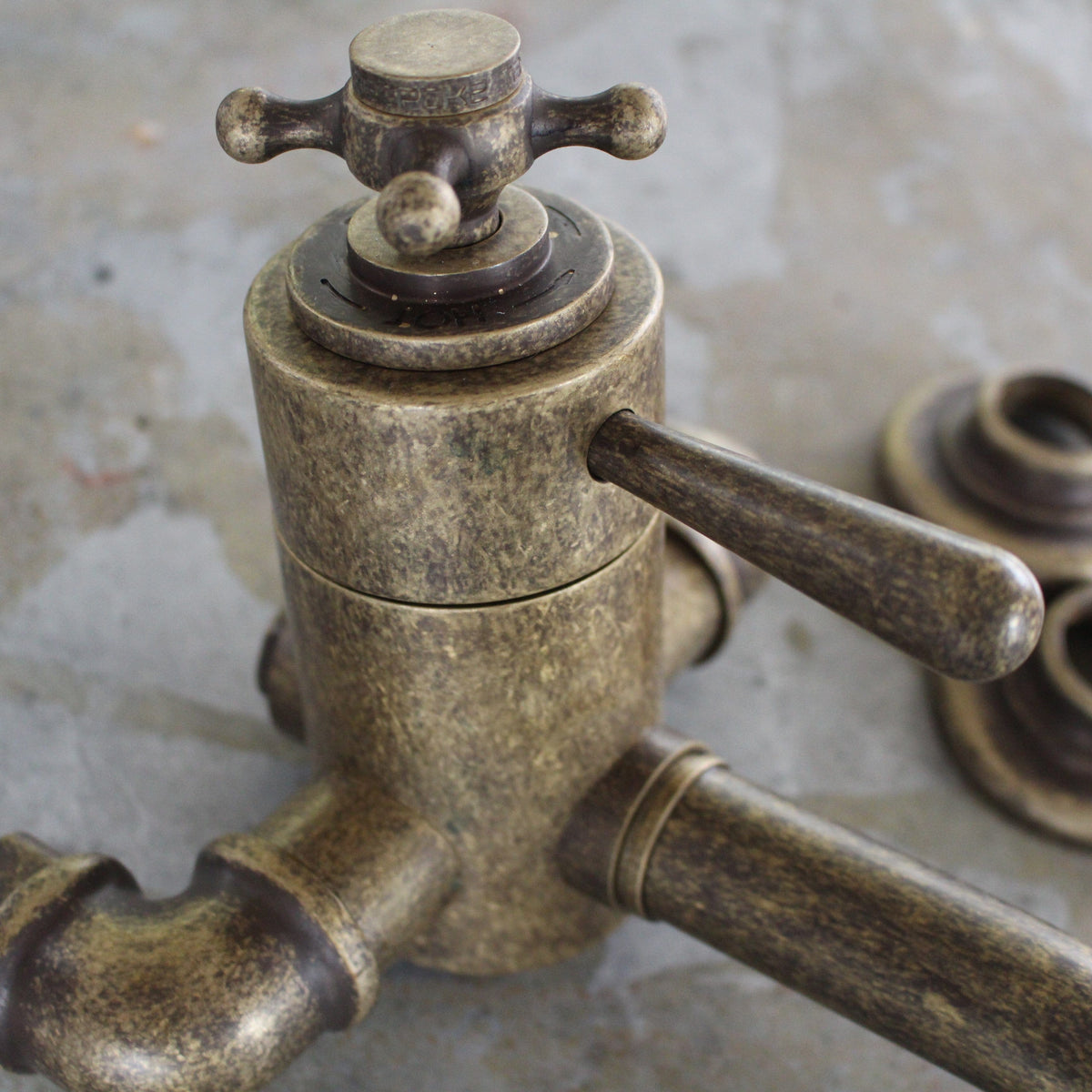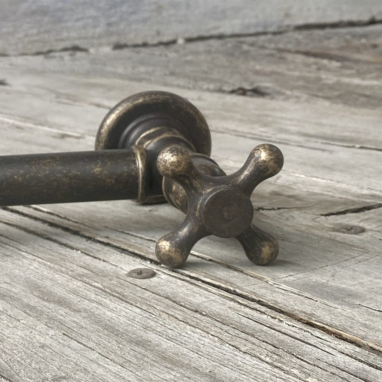 This is simply solid brass with a gunmetal finish, which has then been tumbled. The tumbling allows the brass to show from underneath the gunmetal. This rustic finish starts off looking aged and weathered and will continue ageing and develop a unique patina. Tumbled gunmetal finish is an excellent choice for those who want high-quality and functional bathroom fixtures that stand out from the rest.
