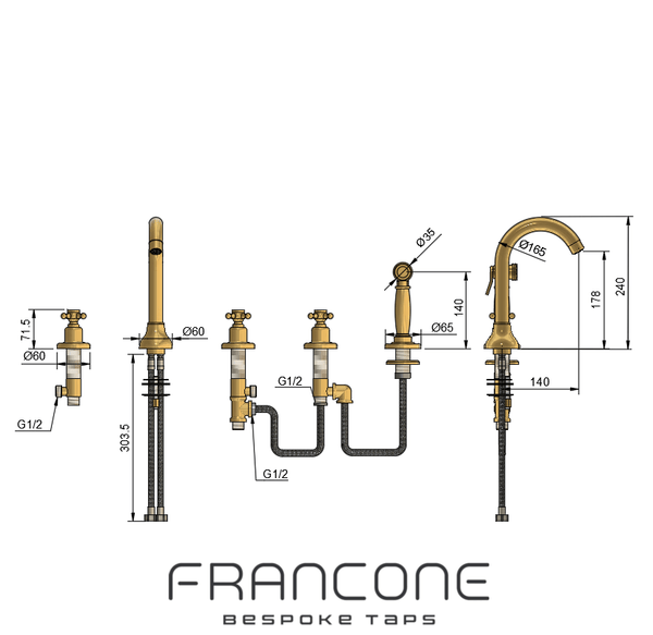 A solid brass deck-mounted tap with handles and spray rinse.