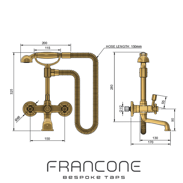 The spout design is available any sizes as per photo in the gallery and is interchangeable with custom models like BT70. The pipe between the tap and the shower cradle can be made to any length - if a custom height is not specified, please see the technical drawing for the dimensions that come as standard. Please select Custom Work 150 at checkout and specify it in the notes. The diverter handle is also available in white resin to match the ceramic handles.